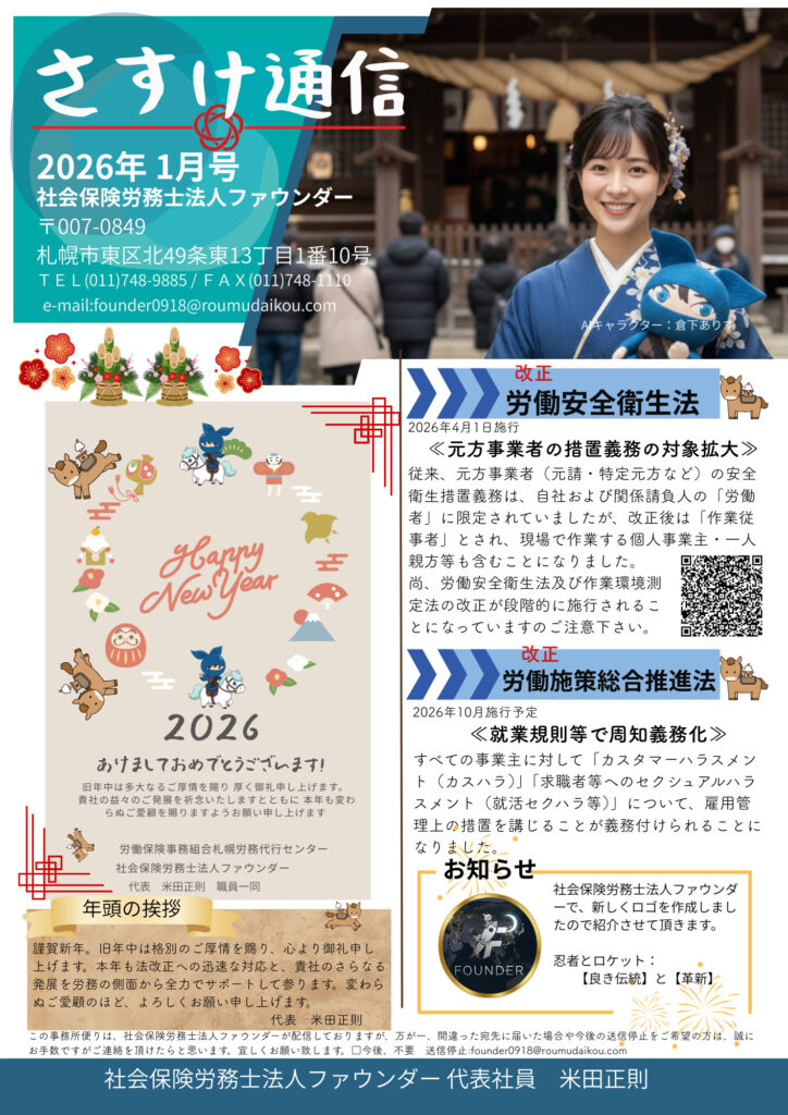 札幌の社労士が解説|2026年労働法改正の重要ポイント – 企業が今すぐ準備すべきこと 新年明けましておめでとうございます。社会保険労務士法人ファウンダー(札幌市東区)です。 2026年は労働安全衛生法や労働 […]